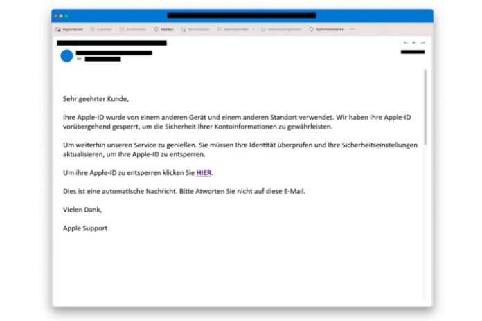 Start Allgemeine Nachrichten "Apple-ID gesperrt" – Betrügerische Mails im Umlauf