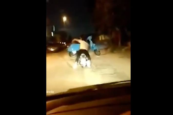 Auf dem Video sieht man zwei Männer auf einem Sooter. Der vordere der beiden jungen Männer kann mit Mühe den Scooter lenken, der zweite Mann hält eine Vespa unter den Armen. So fahren die beiden durch die Ortschaft.