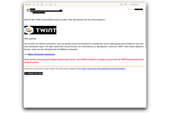 Ignorieren Sie das vermeintliche TWINT E-Mail und löschen oder verschieben Sie es in den Spam-Ordner.
