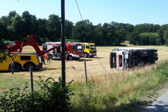 Um 14:09 Uhr wurde neben der hauptamtlichen Wache auch der Rettungsdienst zu der Adresse «In den Stämmen» alarmiert. Aus unbekannter Ursache war hier ein Müllwagen von der Fahrbahn abgekommen und kippte auf ein Stoppelfeld. Dabei wurde auch eine Telefonleitung beschädigt und durchtrennt. Fahrer und Beifahrer wurden bei dem Unfall verletzt, zum Glück jedoch nicht eingeklemmt. Beide zogen sich ein Schleudertrauma und Prellungen zu. Sie wurden mit Rettungsmitteln der Städte Datteln und Waltrop,Krankenhäusern in Datteln und Recklinghausen zugeführt. Die Feuerwehr fing mit Bindemittel und Auffangbehältnissen auslaufende Betriebsstoffe auf.