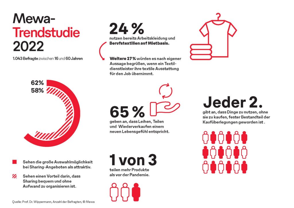Welche Serviceleistungen sich die Befragten aktuell und künftig wünschen, zeigt die Studie von Mewa: «Sharing wird fester Bestandteil von Kaufüberlegungen». Ein zentrales Argument für das Sharing von Arbeits- und Berufskleidung bei knapp zwei Drittel der Befragten ist der Umstand, dass „Sharing bequem und ohne Aufwand zu organisieren ist“. Im übertragenen Sinn ist die Alternative «mieten» statt «kaufen» von Berufstextilien auch eine Frage von Entlastung und Flexibilität und trifft auf steigende Nachfrage. 24% der Befragten nutzen Arbeitskleidung und Berufstextilien bereits auf Mietbasis. Jeder Zweiter gibt an, dass Dinge zu nutzen, ohne sie zu kaufen, ein fester Bestandteil der Kaufüberlegungen geworden ist.