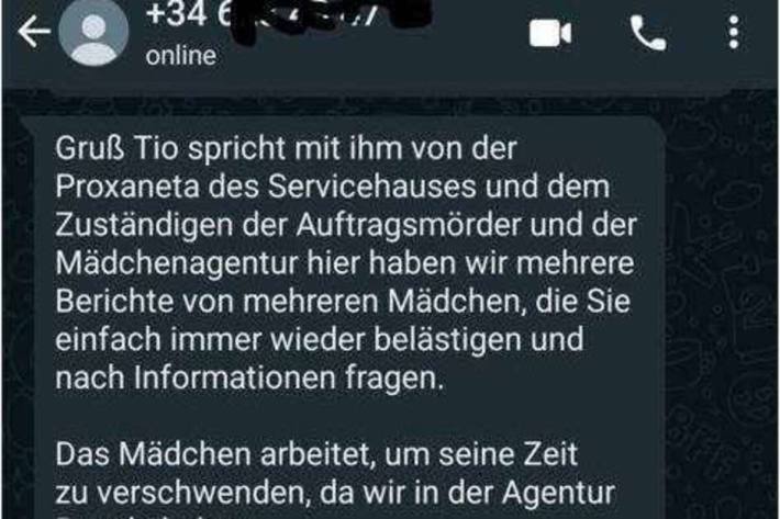 In letzter Zeit häufen sich in der ganzen Schweiz Fälle, in denen Personen nach dem Anklicken eines Links auf Escort Anzeigenportalen im Internet mit dem Tod bedroht wurden. Klickt ein Nutzer mit dem Smartphone auf einen Link, so schickt sein Smartphone eine automatische WhatsApp Nachricht an das Portal. Zunächst geschieht nichts. Allerdings wird dadurch die Handynummer des Nutzers an den Erpresser übermittelt. In der Folge erhält der Nutzer eine üble Drohnachricht über WhatsApp sowohl in Textform, wie auch als Video. Von dieser Drohnachricht gibt es mehrere Varianten, untenstehend ein Beispiel: "Gruß Tio spricht mit ihm von der Proxaneta des Servicehauses und dem Zuständigen der Auftragsmörder und der Mädchenagentur hier haben wir mehrere Berichte von mehreren Mädchen, die Sie einfach immer wieder belästigen und nach Informationen fragen. Das Mädchen arbeitet, um seine Zeit zu verschwenden, da wir in der Agentur Regeln haben. Sie haben Geld verloren, weil die Mädels ihren Dienst abgesagt haben und mit Ihnen gesprochen haben, Sie wissen, wie es in der Mafia hier in ZUIZA funktioniert, wenn Sie nicht möchten, dass dies bei Ihnen und Ihrer Familie zu einem persönlichen Problem wird, wäre es am besten, wenn wir eine Einigung erzielen, da ich 8 meiner besten Männer in der Nähe des Gebiets deiner Stadt aufgehalten habe, die darauf warten, dass du mir eine Antwort gibst, denn wenn du mir nicht antwortest oder mich blockierst, gebe ich dir den Befehl, ihn zu exekutieren und zu bringen ihn hierher auf unsere Ranch zu bringen, damit er ihnen eine Geldstrafe für den bösen Bruder zahlt oder dass sie mich sofort erschießen. Ich will und werde Ihre FAMILIE nicht einbeziehen. ICH WARTE AUF IHRE ANTWORT, WENN SIE DIES ZUM GUTEN TUN WOLLEN ODER WIR ZUM SCHLECHTEN VORGEHEN?"