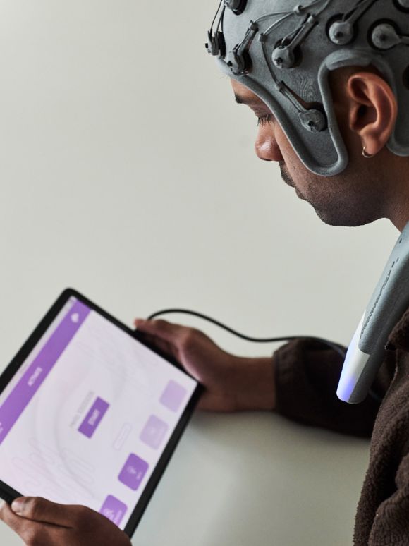 Zum Helm gehören ein Schultergürtel, in dem die Elektronik zur Steuerung der Elektroden untergebracht ist, und ein Tablet. Damit kann der Patient die Therapie starten. Miamind erzeugt über die 34 Elektroden elektrische Felder, die spezifische Hirnregionen anregen. Mit denselben Elektroden kann das Gerät anschliessend auch ein Elektroenzephalogramm (EEG) erstellen und die Veränderungen der Hirnströme messen.