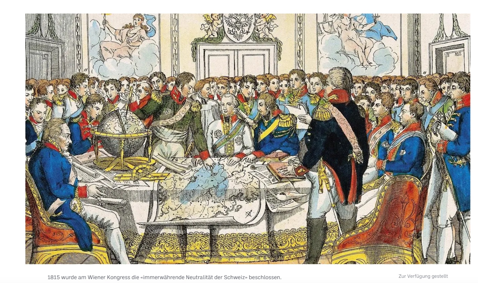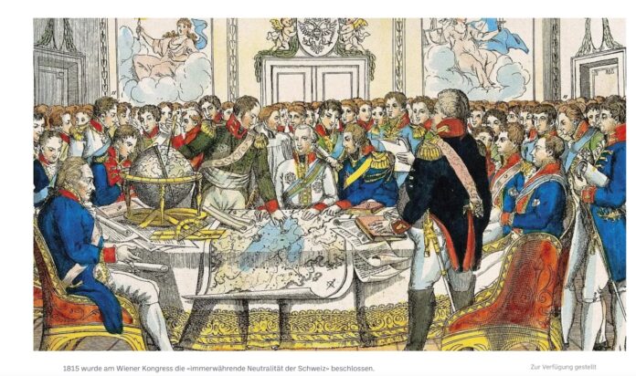 Ein dreiviertel Jahr später, im Jahr 1815, wurde nun an diesem Kongress – nach seiner fast 9-monatigen Dauer vom 18. September 1814 bis zum 9. Juni 1815 – die „immerwährende Neutralität der Schweiz“ beschlossen (Foto).