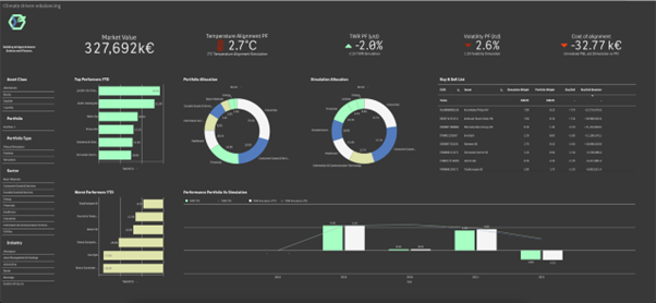 Mit der Software können Anleger nicht nur die Ausrichtung und den CO2-Fußabdruck ihres Portfolios überprüfen, sondern sie bietet auch Alternativen für eine Klimaschutz-getriebene Neuausrichtung: Der Algorithmus prüft die Portfoliostrategie und -restriktionen und generiert die optimale Verteilung der Gewichte für jeden Vermögenswert auf Basis der Prioritäten des Kunden (Klima, Performance und/oder Risiko).