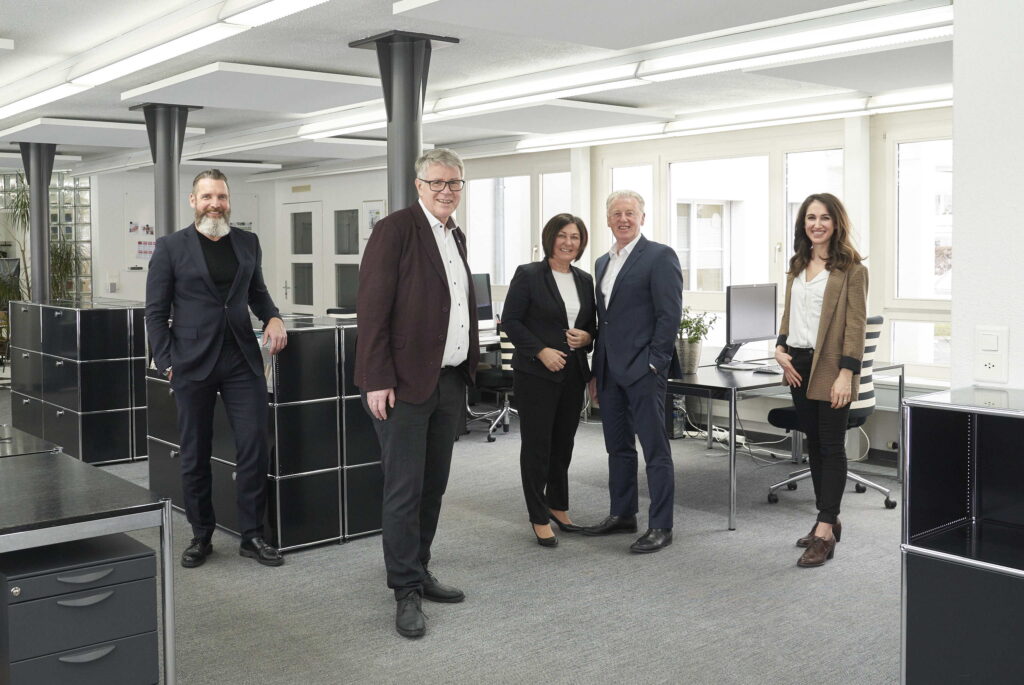 Bild (v.l.n.r.): Daniel Ettlinger, CEO galledia group, Urs Schneider, VRP galledia group, Ruth und Reinhard Frei, Inhaber freicom ag, Alexandra Vorburger-Frei, Leiterin Events freicom ag