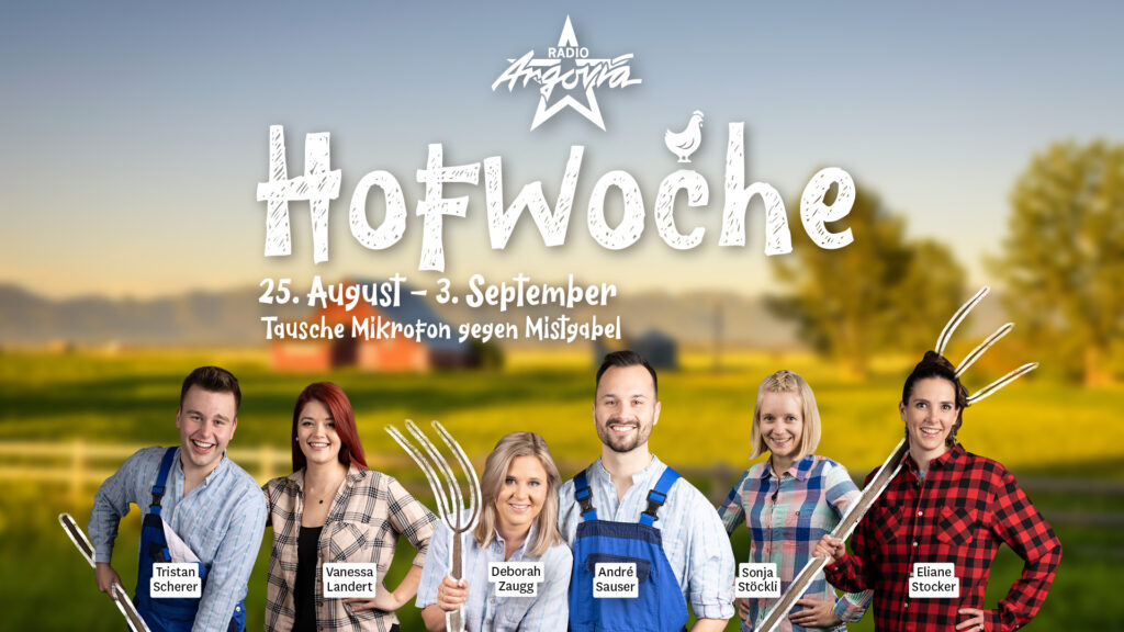 Am 25. August zieht das Team von Radio Argovia auf den Bauernhof. Wenn die Moderatorinnen und Moderatoren nicht hinter dem Mikrofon stehen, müssen sie auf dem Milchwirtschaftsbetrieb der sechsköpfigen Familie Meier richtig anpacken! Vom Füttern der Tiere über das Heuen und Güllen, bis hin zum Assistieren beim Kalben oder beim Besamen der Kühe – in der «Radio Argovia-Hofwoche» steht einiges auf dem Programm. Während der Hofwoche diskutiert das Aargauer Radioteam diverse Thematiken rund um die Landwirtschaft wie Subventionen, Pestizide, Innovationen und die Work-Life-Balance. Zudem werden auch Fragen beantwortet, die sich jede und jeder schon einmal gestellt hat. Wie viel Milch gibt eine Kuh pro Tag? Wie schwierig ist das Thema Nachfolgeregelung auf dem Bauernhof? Kann ein Bauer auch einmal Ferien machen? Wie viele Frauen werden Bäuerin? Dabei kommt eine breite Auswahl an Interviewpartnern zu Wort: Landwirte in Ausbildung, Vertreter des Bauernverbands, Veterinäre, Milch-Abnehmer und viele mehr. Als Special Guests besuchen Regierungsrat Markus Dieth und «BAUER, LEDIG, SUCHT…»-Moderator Marco Fritsche das Radioteam.